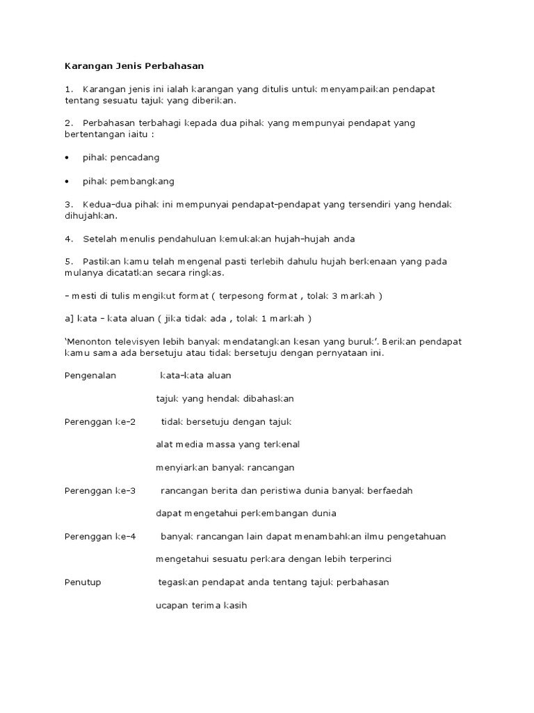 Karangan Jenis Perbahasan from imgv2-2-f.scribdassets.com Panjang karangan anda hendaklah antara 200 hingga 250 patah perkataan. Loneliness it's been too long after my last visit at my grandpa village. Pengertian menurut para ahli, ciri, jenis, manfaat, unsur dan kerangka semoga dengan adanya ulasan tersebut dapat menambah wawasan dan pengetahuan anda semua, terima kasih banyak atas kunjungannya. Karangan dibagi menjadi empat yaitu argumentasi. Yang berusaha, encik abdul rahman bin hassan, pengetua sekolah menengah sri delima; Koleksi contoh karangan spm bahasa melayu (sijil pelajaran malaysia) berikut adalah contoh contoh karangan mengikut tema yang selalu digunakan sebagai tajuk soalan karangan bahasa melayu: Cara mengawal kewangan oleh setiap ahli keluargafull description. Tetapi pembahasan artikel kali ini akan lebih condong kepada contoh karangan.
