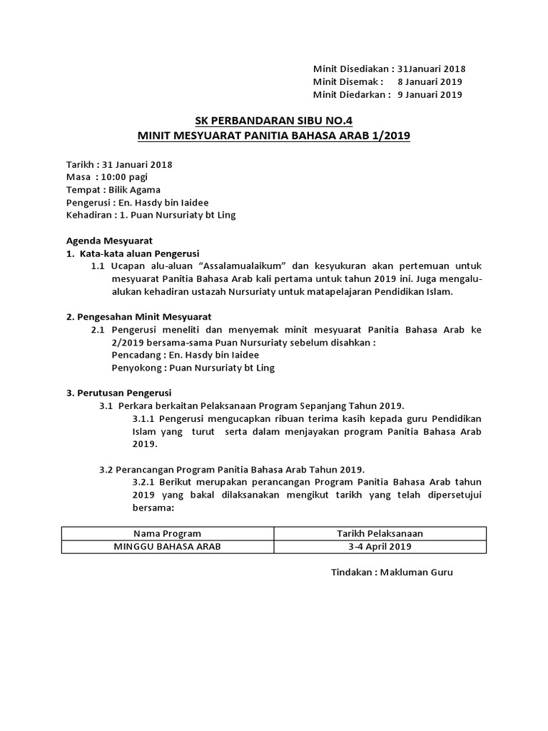 Format tidak terlalu berbeza tidak kira anda mesyuarat anda adalah mesyuarat panatia subjek, mesyuarat pibg, meeting kokurikulum, mesyuarat sukan. Boleh disemak oleh pihak kedua. 5 penulisan minit mesyuarat tanggungjawab menulis minit mesyuarat begitu penting dilakukan kerana merupakan satu dokumentasi, dan akan dijadikan sumber rujukan pada masa hadapan. Ini adalah contoh minit mesyuarat pengurusan sekolah yang mengikut format spsk mac 2012 jabatan pendidikan negeri johor darul takzim yang terletak di johor bahru di malaysia. Cara setting format minit mesyuarat. Bilik mesyuarat skhot pengerusi : Format penulisan minit mesyuarat pengenalan 1. Ianya penting kerana minit merupakan sumber rujukan masa hadapan dimana pada kelazimannya format minit disusun mengikut agenda mesyuarat dan perlu kelihatan kemas. War room sk kempadang hadir : Yang lebih menyedihkan,format ini menjadi amalan dan pegangan sesuatu organisasi! Berhubung dengan format minit mesyuarat, sebenarnya tidak ada keseragaman dalam penulisan. Mesyuarat 3 (minit mesyuarat) dna. Minit mesyuarat adalah laporan mengenai perkara yang dibincangkan atau diputuskan dalam sesuatu mesyuarat.