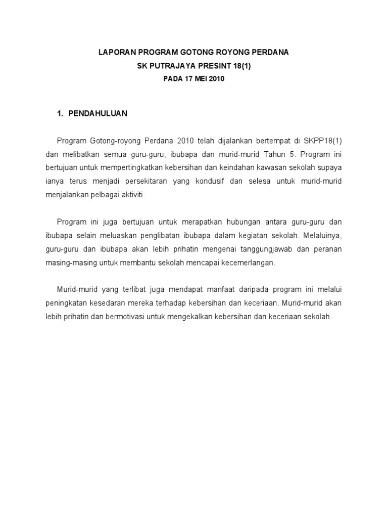 Dokumentasi laporan gotong royong perdana 2017 tarikh. Contoh karangan laporan gotong royong membersihkan kawasan sekolah srasmi. Laporan gotong royong persatuan bulan sabit merah sekolah kebangsaan jerantut pada 18 jun 2009 persatuan bulan sabit merah telah mengadakan gotong royong sempena kempen kebersihan bagi tahun 2009. Doc kertas kerja gotong royong math1 kohort1 ppgiptho academia edu. Soal revisi sd smp sma.