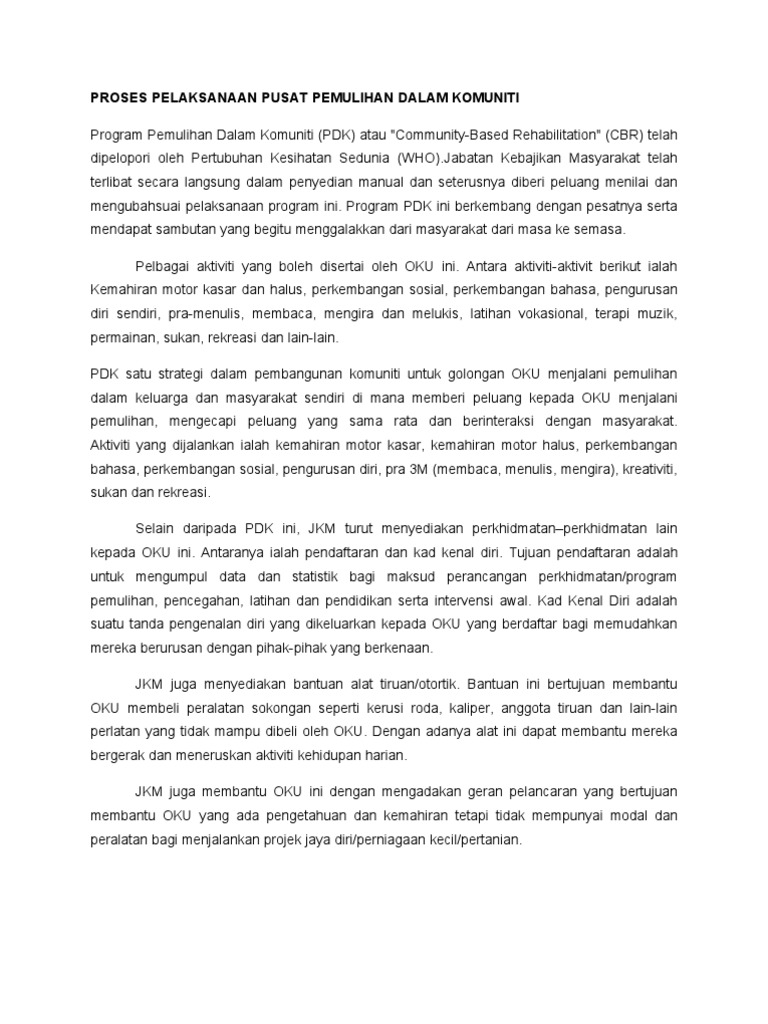 Prin prinsip2 sip2 yang mend mendasari asari pertu pertubua bu<b>ann pdk. Vokasional/program pemulihan carakerja 70%, akademik 30%. See more of program pemulihan dalam komuniti daerah kuala kangsar on facebook. (i) setiap pelatih oku yang mengikuti program pemulihan di pusat pdk dan di rumah perlu mengisi borang pendaftaran pelatih pdk dan didaftarkan di dalam buku daftar (v) aktiviti yang dijalankan hendaklah melibatkan oku , ibubapa,jawatankuasa pdk,penyelia,petugas pdk dan komuniti setempat. Program pemulihan dalam komuniti (pdk) atau. Ianya merupakan satu strategi dalam pembangunan komuniti setempat bagi pemulihan, latihan, pendidikan, penyamaan peluang dan integrasi sosial orang kurang upaya program ini dikendalikan di seluruh negara dengan penglibatan aktif komuniti sama ada di pusat pdk atau di rumah. Alhamdulillah segalanya berjalan dengan lancar dan tiada kemalangan. Berfungsi sebagai perantara organisasi dengan kerajaan tempatan, rakyat dan institusi pendidikan, berkaitan dengan pemulihan dan pembaharuan, masalah sosial dan perayaan. Share & embed <b>pemulihan dalam komuniti. Pdk dilaksanakan melalui usaha bersepadu oku,keluarga, komuniti dan perkhidmatan kesihatan, pendidikan. Setelah beberapa buah negara membangun berjaya melaksanakan konsep cbr yang dicadangkan who. Sejarah penubuhan pusat pemulihan dalam komuniti (cbr). Semester 1 sesi 2016 / 2017.